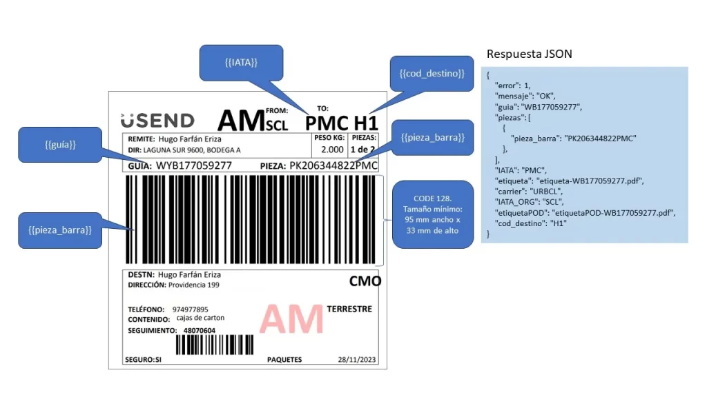 Este formulario envía un JSON de ejemplo al endpoint de producción, utilizando autenticación básica y la estructura de datos esperada. El resultado se muestra directamente en pantalla, incluyendo la guía generada y el enlace a la etiqueta PDF.